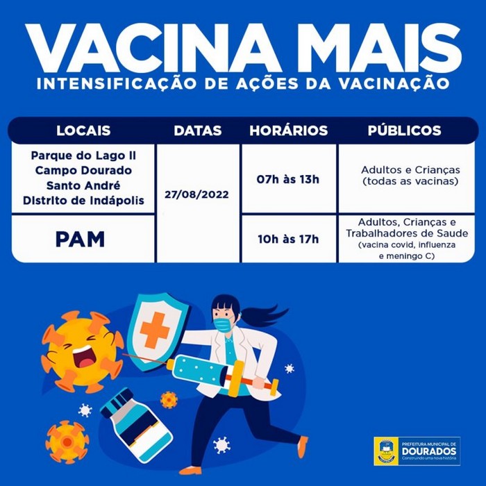 A Prefeitura de Dourados, através da Sems (Secretaria Municipal de Saúde) realiza neste sábado (27), mais um mutirão de imunização do programa “Vacina Mais”. As doses estarão disponíveis nas UBS (Unidade Básica de Saúde) dos bairros Parque do Lago II, Campo Dourado, Santo André, no Distrito de Indápolis e na sala de vacinação do PAM.
