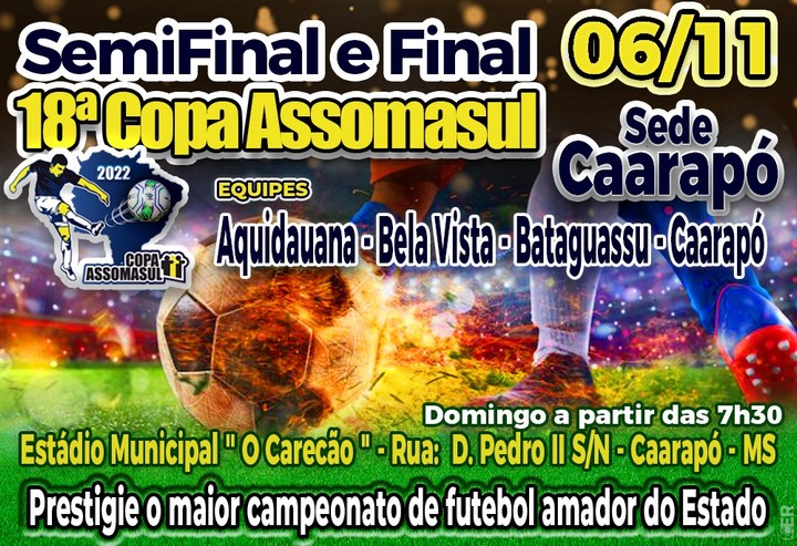 A 18ª Copa Assomasul, edição de maior número de equipes inscritas, será decidida no próximo dia 6 de novembro em Caarapó. Quatro equipes chegam nessa fase final em altíssimo nível. Aquidauana, Bataguassu, Bela Vista e Caarapó vão disputar o sonhado título de campeão. Dos finalistas, Bataguassu e Caarapó nunca venceram a competição.