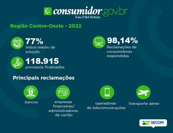 Ao se considerar o panorama regional, no Centro-Oeste, a média de solução de reclamações chega a 77%, ficando na quarta posição no país. Nas três primeiras colocações, estão as Regiões Norte (78,26%); Sul (78,25%) e Nordeste, com 77,41%, respectivamente.