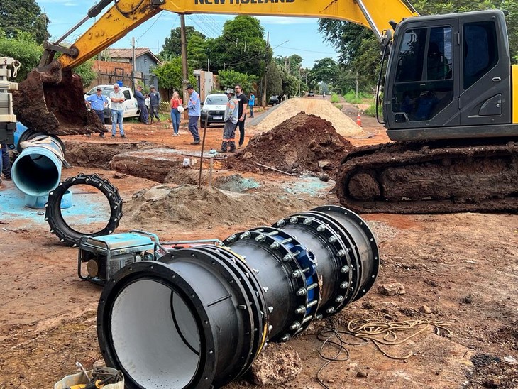 Em Dourados, a Sanesul está com uma grande frente de trabalho para a realocação de uma adutora de 600 mm existente no trecho entre o condomínio Roma e o Cachoeirinha.