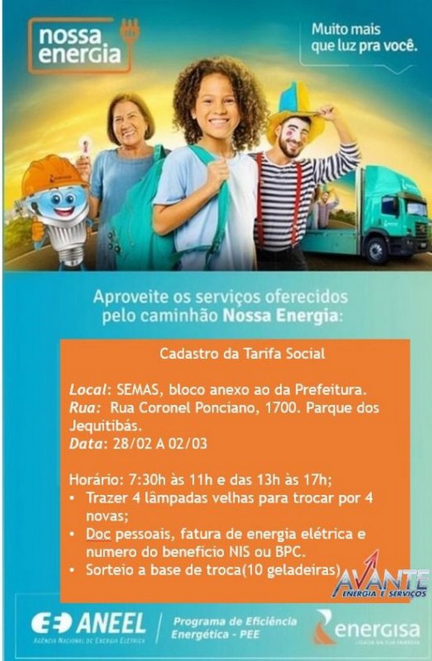 A Prefeitura de Dourados, por meio da Semas (Secretaria Municipal de Assistência Social), realiza, em parceria com a Energisa, mutirão de cadastro e avaliação para tarifa social da energia elétrica. A ação conjunta acontece de 28 de fevereiro a 2 de março no pátio da Semas, das 7h30 às 11h e das 13h às 17h, bloco anexo ao Paço Municipal. Podem participar todos os cidadãos que se enquadrem nos requisitos definidos pela concessionária responsável pelo fornecimento de energia. Basta comparecer munido dos documentos exigidos.