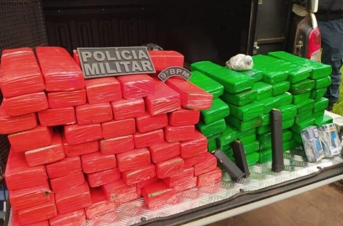 Durante a revista nos objetos, os policiais militares se depararam com uma grande quantidade de drogas (87 quilos), três carregadores de pistola – sendo um alongado – e 124 munições de 9 milímetros.