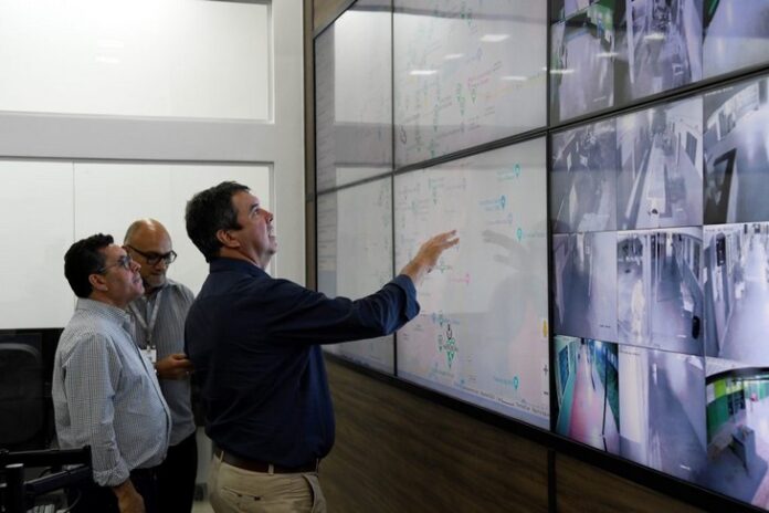 governador Eduardo Riedel visitou no final do expediente desta quinta-feira (30) a Centro de Monitoramento das escolas da Rede Estadual de Ensino, que fica em Campo Grande, no bairro Amambaí. O local tem o controle em tempo real das unidades que já dispõe de câmeras e sistema eletrônico, que fazem a vigilância da unidade, para levar segurança aos alunos e profissionais. Ele tem pressa e urgência em tratar do tema, que virou pauta nacional após a tragédia em São Paulo.
