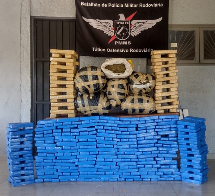 A equipe flagrou no interior do veículo vários invólucros e tabletes de entorpecentes, que após vistoria totalizaram 275 kg de maconha e 42 kg de Skank, bem como constatado que o veículo possuía registro de furto no Estado de São Paulo.