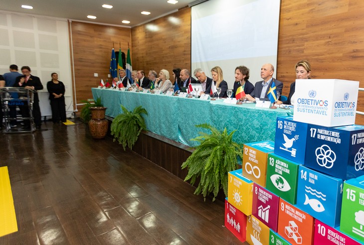 Foco do encontro e direcionador da atuação dos representantes da UE no Brasil e no mundo, o coletivo de Objetivos de Desenvolvimento Sustentável (ODS) é composto por 17 tópicos interconectados que abordam desafios de desenvolvimento enfrentados por toda a população mundial, estabelecidos pela Agenda 2030 da Organização das Nações Unidas (ONU).
