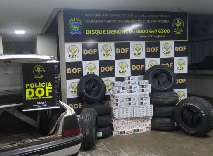 No sábado (22) o DOF apreendeu na MS-162, zona rural de Maracaju, 253 pacotes de cigarros e 50 pneus em um GM/Monza. O veículo estava abandonado e ninguém foi preso.