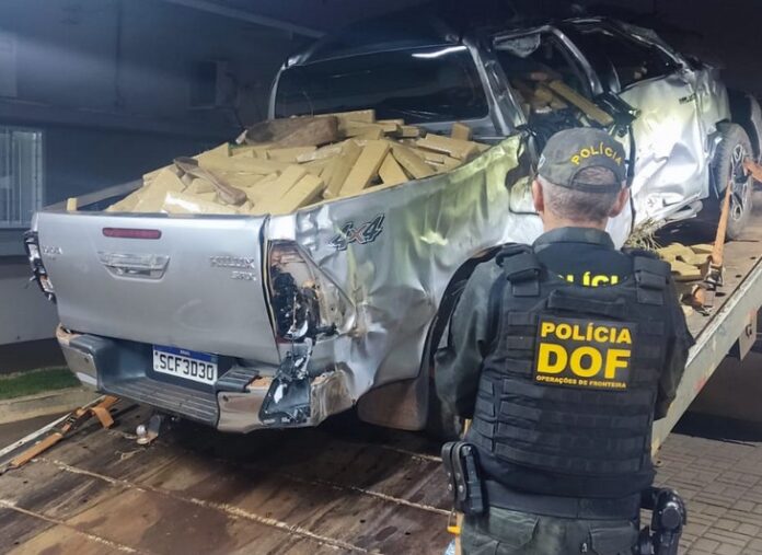 Por alguns quilômetros o homem, de 31 anos de idade, invadiu a pista contrária de direção e colocou em risco a vida dos usuários da via. Em determinado momento, o condutor perdeu o controle da caminhonete, saiu da pista e capotou a Hilux espalhando grande quantidade de volumes prensados da droga pelo local.