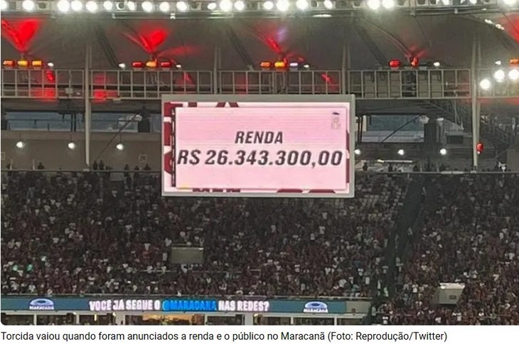 O primeiro jogo da final da Copa do Brasil na tarde deste domingo no Maracanã em que o Flamengo  perdeu para o São Paulo  por 1 a 0  marcou a maior renda de bilheteria da história do futebol brasileiro. Segundo ao Lance!., com um público presente de 67.350 pessoas, a renda total foi de R$ 26.343.300,00.