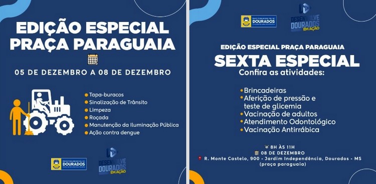 A Prefeitura de Dourados avança com os trabalhos do Desenvolve Dourados em Ação que desta vez acontece em edição especial na região da Praça Paraguaia, no Jardim Independência. Em alusão ao dia da padroeira do Paraguai, Nossa Senhora de Caacupé, no feriado do dia 8 de dezembro haverá a ‘Sexta Especial’ no local.