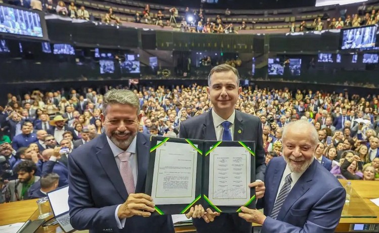 A cerimônia, realizada no Plenário da Câmara, tem a presença dos presidentes Luiz Inácio Lula da Silva, do Congresso Nacional, Rodrigo Pacheco; da Câmara dos Deputados, Arthur Lira; e do Supremo Tribunal Federal (STF), Luís Roberto Barroso.