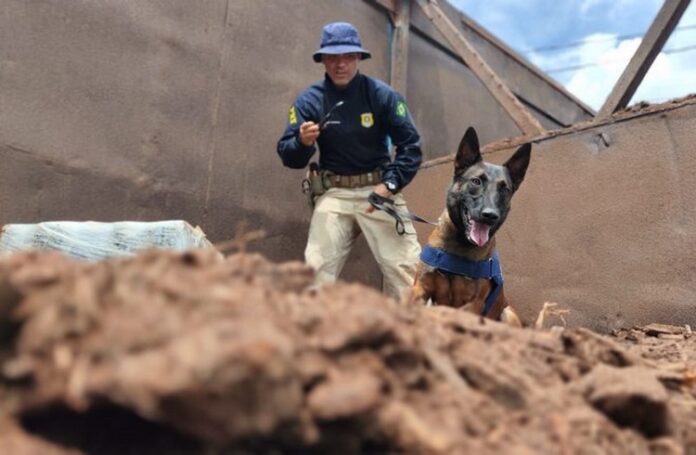 A equipe do Grupo de Operações com Cães da PRF foi acionada para auxiliar na vistoria da carga, de serragem de madeira. Os cães K9 Thor e K9 Zorro indicaram a presença de drogas na carga.