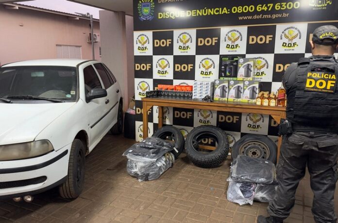 Os policiais faziam bloqueio na BR-267, próximo à MS-462, quando abordaram um VW Gol, conduzido pelo suspeito. Durante vistoria no veículo foram encontrados cigarros, pneus, eletrônicos, vestuários, bebidas alcóolicas além de um revólver calibre .38 e seis munições intactas.