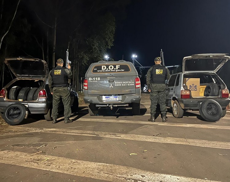 Os policiais faziam bloqueio na rodovia, quando abordaram os carros. Durante vistoria, foram encontrados nos veículos 74 pneus de diversas medidas, além de cem pacotes de cigarros contrabandeados. Questionados, ambos os motoristas afirmaram que pegaram os produtos em Pedro Juan Caballero, no Paraguai, e levariam até Campo Grande.