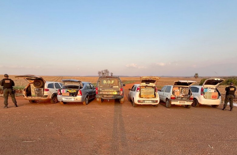 Cinco veículos carregados com produtos de contrabando e descaminho foram apreendidos pelo DOF (Departamento de Operações de Fronteira), nesta terça-feira (20), em Maracaju. Cinco homens, com idades entre 23 anos e 32 anos, que conduziam os carros foram detidos.