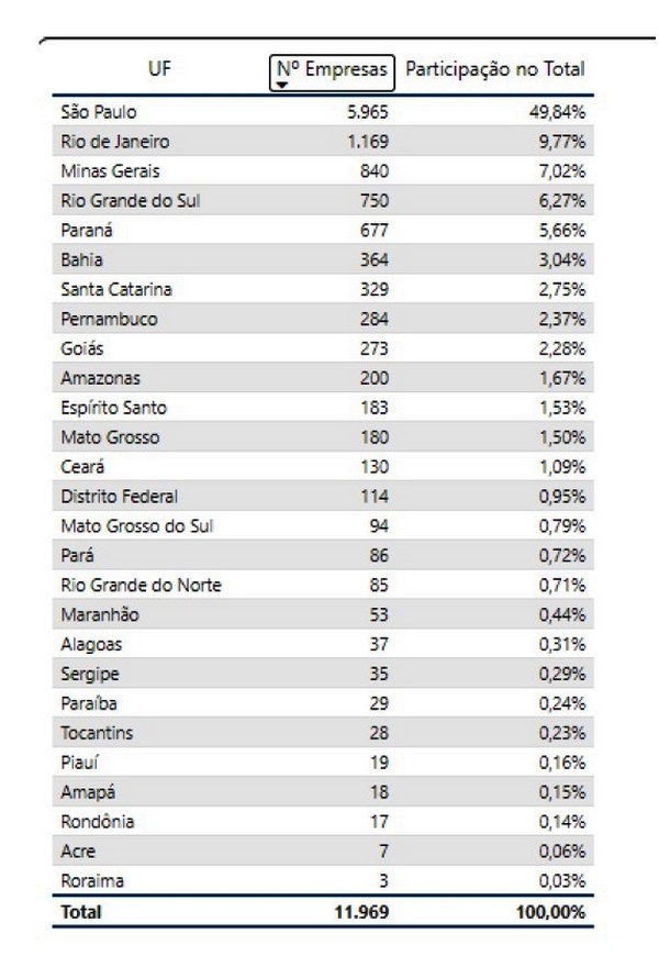 Os primeiros colocados foram São Paulo (49,84% do total), Rio de Janeiro e Minas Gerais. O Estado se destaca principalmente em setores agroindustriais, como fábricas de papel, refino de cana-de-açúcar e preparação de alimentos, com investidores de países como Estados Unidos, Alemanha, Países Baixos e França.