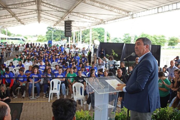 Com 43,7 mil estudantes beneficiados pelo programa Pé-de-Meia – incentivo financeiro-educacional, na modalidade de poupança – para garantir a permanência e a conclusão escolar de estudantes matriculados no Ensino Médio da rede pública de Mato Grosso do Sul, foi formalizada hoje (13) a expansão das ações do programa no Estado. O governador Eduardo Riedel participou da cerimônia de anúncio de investimentos do MEC (Ministério da Educação) para a educação e a saúde no Estado, realizada no IFMS (Instituto Federal de Mato Grosso do Sul).