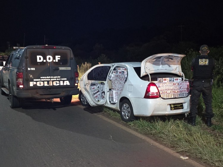 Policiais militares do Departamento de Operações de Fronteira (DOF) apreenderam na noite desta quarta-feira (15) na MS-164 com a MS-384, área rural do município de Ponta Porã, um veículo Toyota Etios carregado com 2.100 pacotes de cigarros contrabandeados do Paraguai. Na ação, o condutor de 29 anos de idade foi preso.
