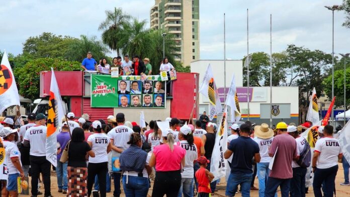 Na Praça do Rádio, no Centro, os manifestantes participaram do ato. Dirigentes sindicais e representantes de partidos de esquerda se revezaram para discursar contra o projeto de anistia para os presos e condenados pela invasão e depredação dos prédios dos três poderes em Brasília no dia 8 de janeiro de 2023.