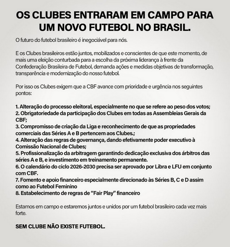 No texto, os clubes afirmam que o momento exige medidas objetivas de transformação. “O futuro do futebol brasileiro é inegociável para nós”, destaca o comunicado. As equipes reforçam a necessidade de modernização e mais transparência na condução da CBF, diante de mais uma disputa considerada conturbada para definição da nova liderança.