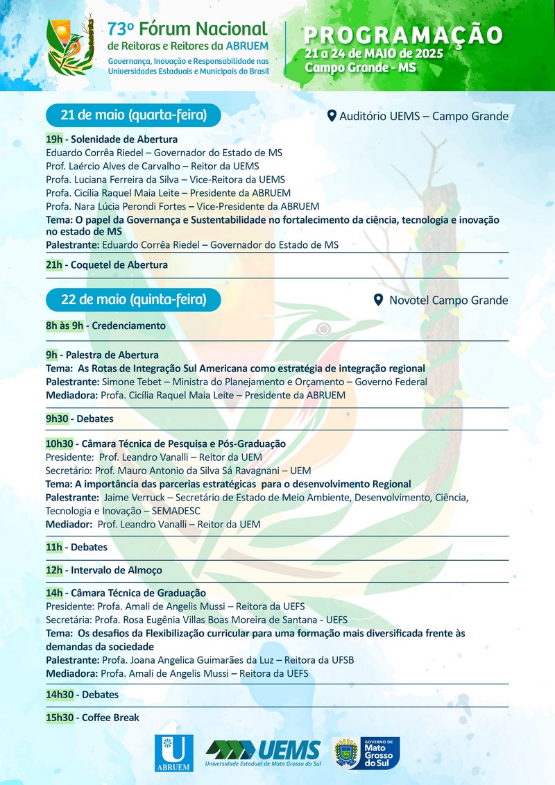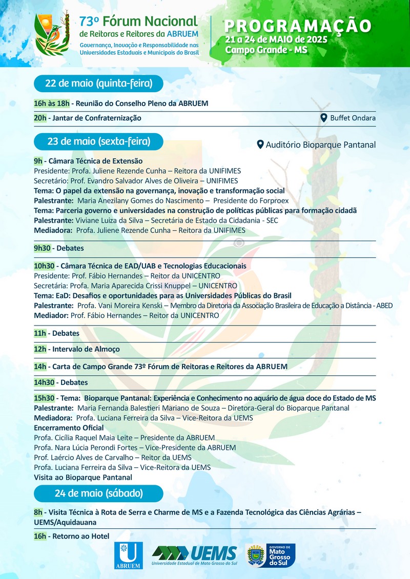 A Universidade Estadual de Mato Grosso do Sul (UEMS) recebe a partir desta quarta-feira (21/05), até sábado (24/05), o 73º Fórum Nacional de Reitoras e Reitores da Associação Brasileira de Reitoras e Reitores das Universidades Estaduais e Municipais (ABRUEM). A solenidade de abertura ocorre às 19 horas no Auditório da UEMS/Campo Grande.