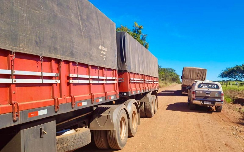No local, os policiais abordaram uma das carretas que deixava a fazenda carregada com soja e prenderam o motorista. Informações colhidas pela equipe apontaram que outras duas carretas já haviam saído em direção ao município de Camapuã.