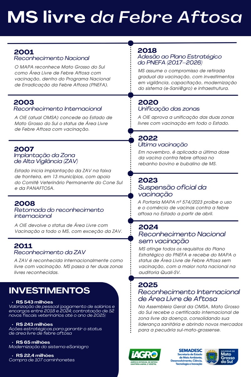 “É um momento histórico para Mato Grosso do Sul. Em 2005 tivemos a reintrodução do vírus da febre aftosa no Estado. Desde então, estruturamos nossas equipes, reforçamos as unidades de fiscalização, investimos na educação sanitária do produtor e mantivemos campanhas sistemáticas de vacinação. Nos últimos dois anos, suspendemos a vacinação e seguimos todos os protocolos internacionais. Agora, com o reconhecimento oficial da OMSA, abrimos uma nova etapa para o Estado, tanto do ponto de vista da sanidade animal quanto da ampliação de mercados”, destacou o secretário Jaime Verruck.