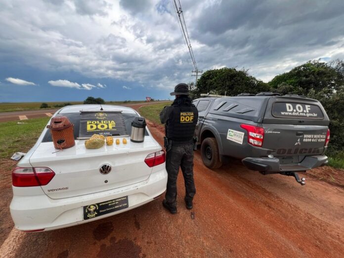 Em vistoria no interior do automóvel, foram encontradas duas garrafas térmicas com 445 gramas de maconha. Questionada sobre a droga, informou que pegou o entorpecente em Coronel Sapucaia e levaria para o marido, que está preso no Presídio Estadual de Dourados.