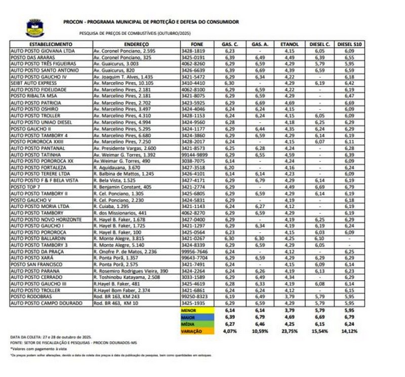 A Prefeitura de Dourados, por intermédio do setor de fiscalização do Procon de Dourados, divulgou nesta terça-feira nova pesquisa de preços de combustíveis. O levantamento foi realizado nos dias 27 e 28 de outubro, em 40 estabelecimentos da cidade e distritos.