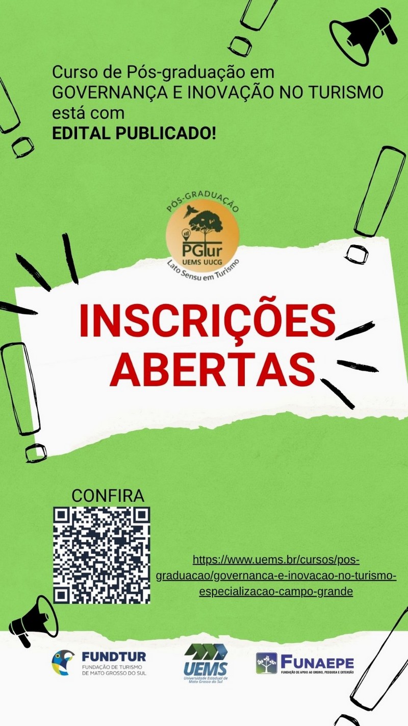 A Universidade Estadual de Mato Grosso do Sul (UEMS) está com inscrições abertas para o Curso de Pós-Graduação Lato Sensu em Governança e Inovação no Turismo, proposto pelo Colegiado do Curso de Pós-Graduação em Gestão de Turismo. O processo seletivo já está disponível e o edital pode ser consultado na íntegra na aba Processo Seletivo – ingresso 2025/2026.