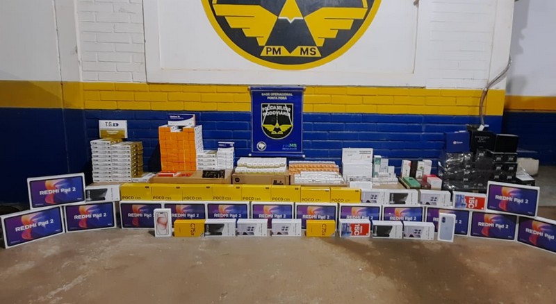 Na noite desta terça-feira (09/12), por volta das 20h20, durante fiscalização de trânsito e ações de combate a crimes transfronteiriços na MS-164, km 105, a equipe da Polícia Militar Rodoviária abordou um veículo VW Gol branco que seguia no sentido Ponta Porã x Itamarati. Durante a vistoria, foram identificadas grandes quantidades de medicamentos, eletrônicos e cosméticos de origem estrangeira, todos sem documentação fiscal ou comprovação de regular importação.