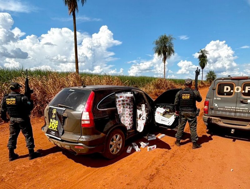 Policiais militares do DOF (Departamento de Operações de Fronteira) apreenderam, na tarde de domingo (8), um veículo Honda CR-V carregado com 50 caixas de cigarros contrabandeados do Paraguai. A ação ocorreu na rodovia MS-465, conhecida como Estrada do Suez, na região de Rio Brilhante.