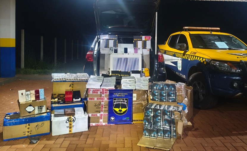 Durante vistoria no interior do automóvel, os policiais localizaram diversos produtos de origem estrangeira sem documentação fiscal, distribuídos no banco traseiro e no porta-malas.