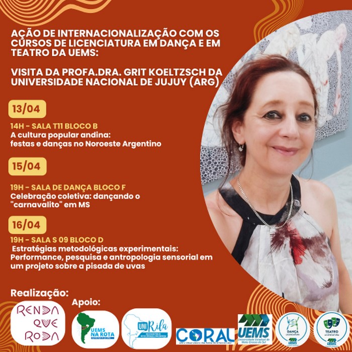 A Universidade Estadual de Mato Grosso do Sul (UEMS), por meio da Unidade Universitária de Campo Grande (UUCG), realiza, na próxima semana, uma importante ação de internacionalização envolvendo o Grupo de Pesquisa em Danças Populares Brasileiras “Renda que Roda” e os cursos de Licenciatura em Dança e em Teatro. A iniciativa contará com a visita da professora Dra. Grit Koeltzsch, da Universidade Nacional de Jujuy, na Argentina.