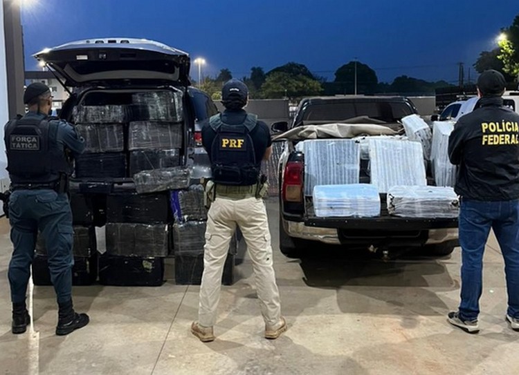A Polícia Rodoviária Federal (PRF), a Polícia Federal (PF) e a Polícia Militar (PM) apreenderam 1.592 quilos de maconha e recuperaram dois veículos, neste domingo (12), em Mundo Novo/MS.