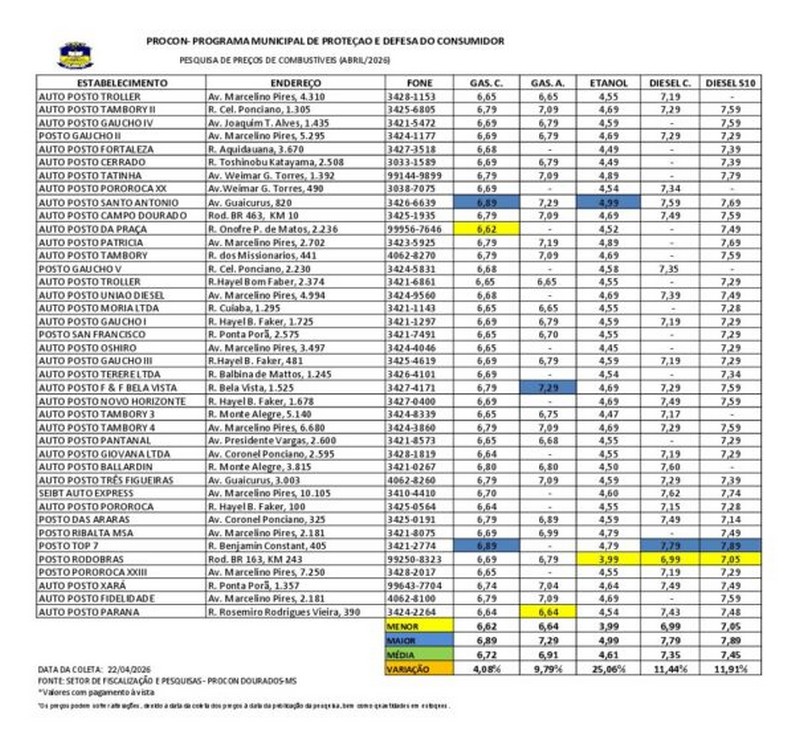 A Prefeitura de Dourados, por meio do Procon, divulgou nesta semana o resultado de mais uma pesquisa de preços de combustíveis realizada no município. O levantamento foi feito no dia 22 e abrangeu 40 estabelecimentos localizados na cidade e nos distritos.